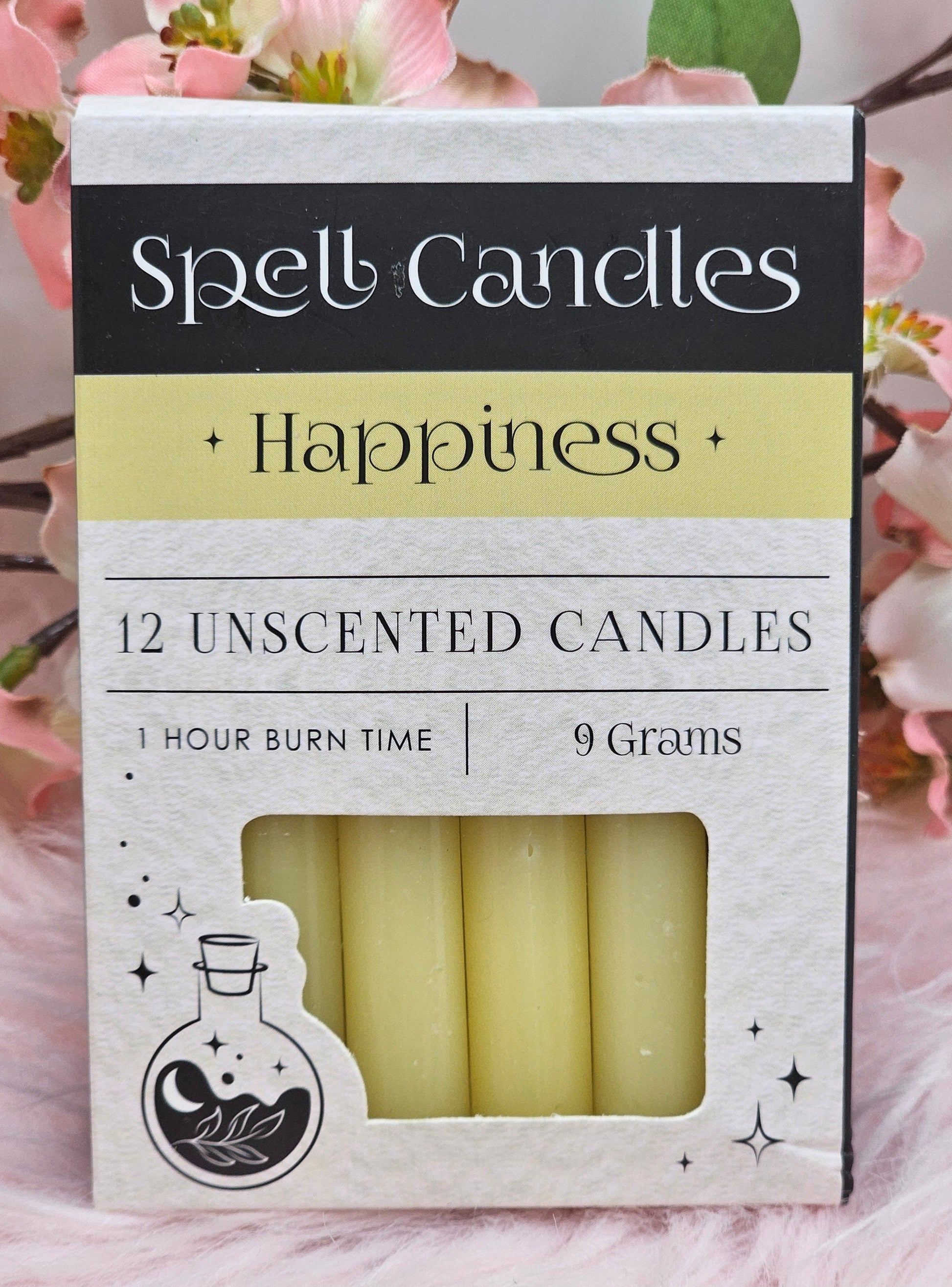 Pack of 12 yellow spell candles for use with rituals to attract happiness and positivity.