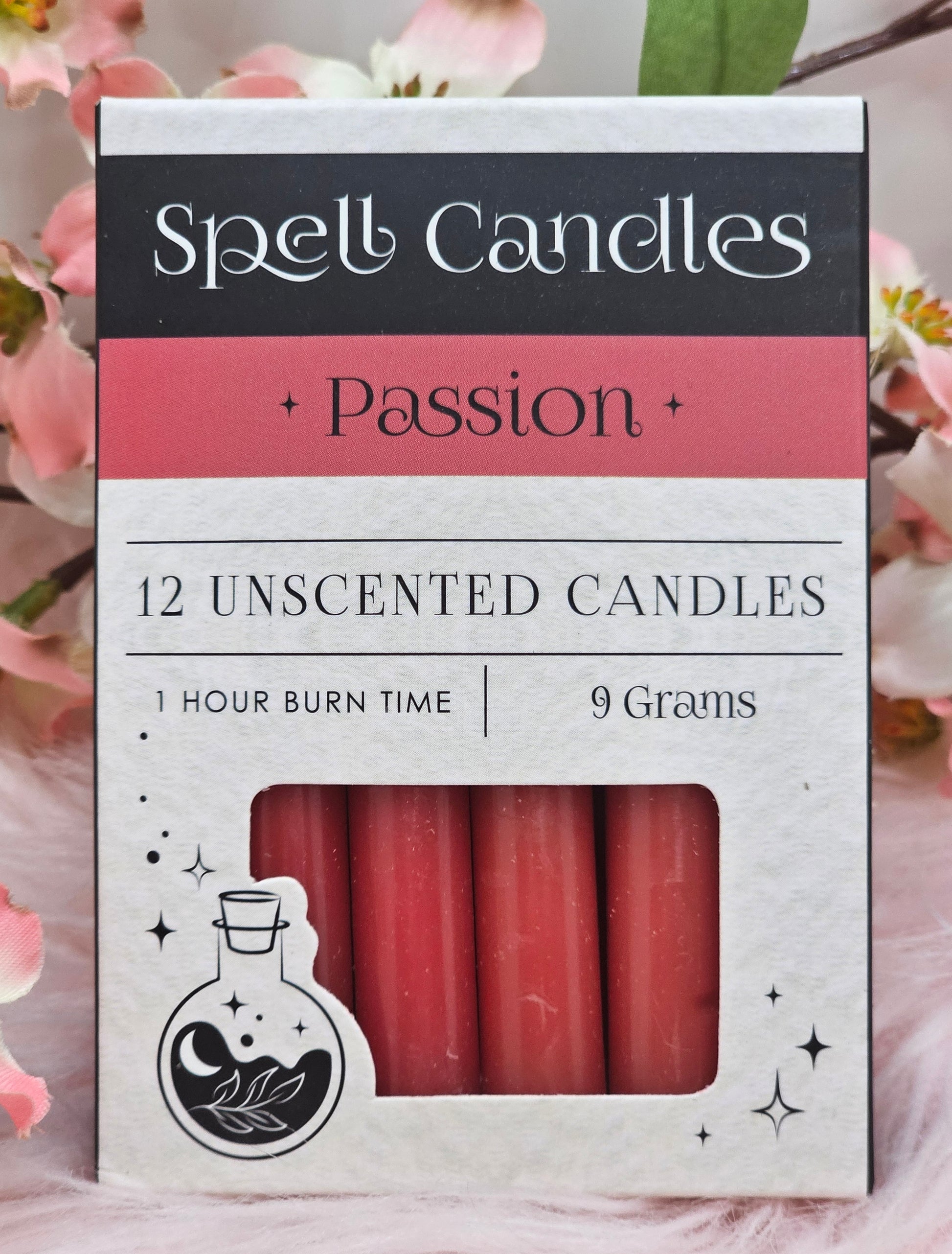 Pack of 12 red spell candles for use with rituals to attract passion and love.