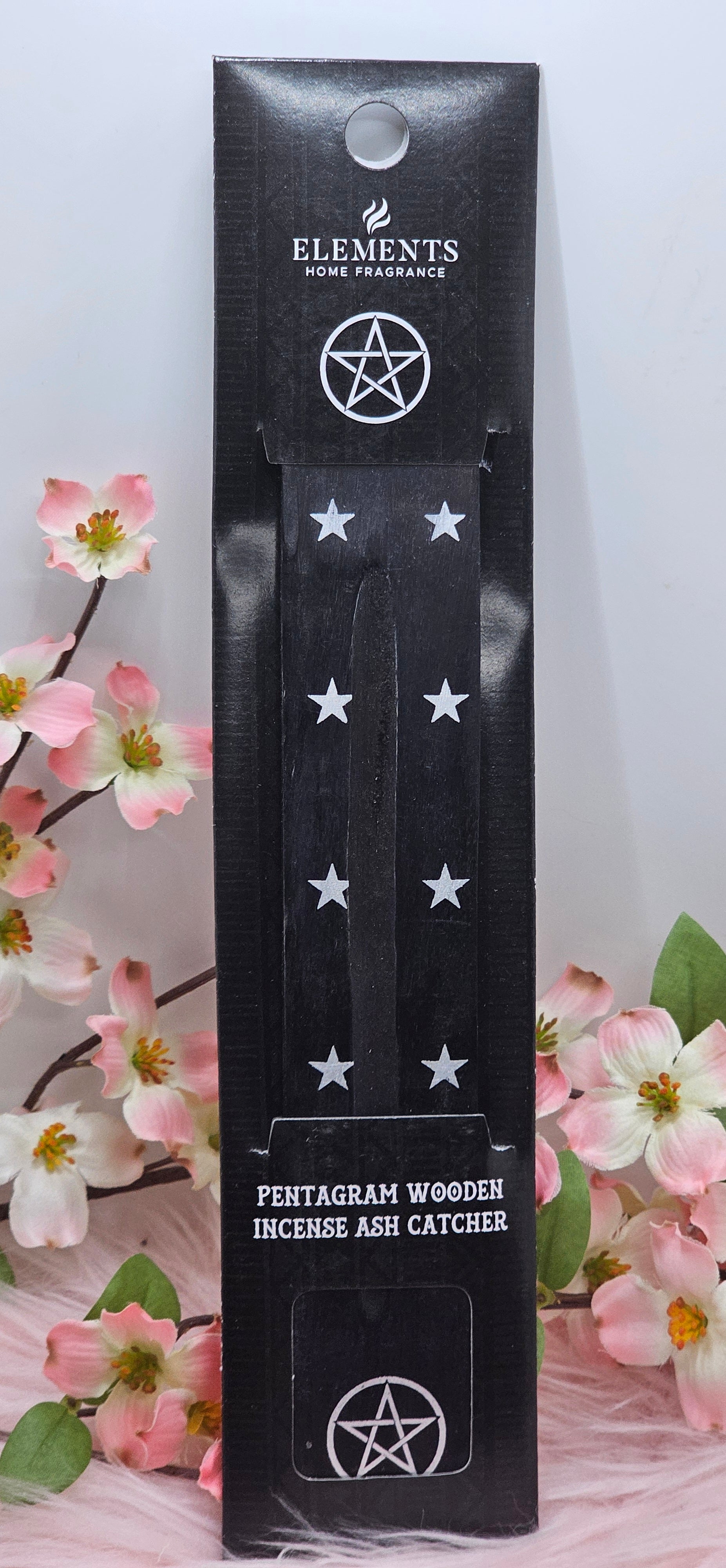 This gothic take on a traditional incense stick ash catcher is made from mango wood and features a printed pentagram symbol accented by silver stars
