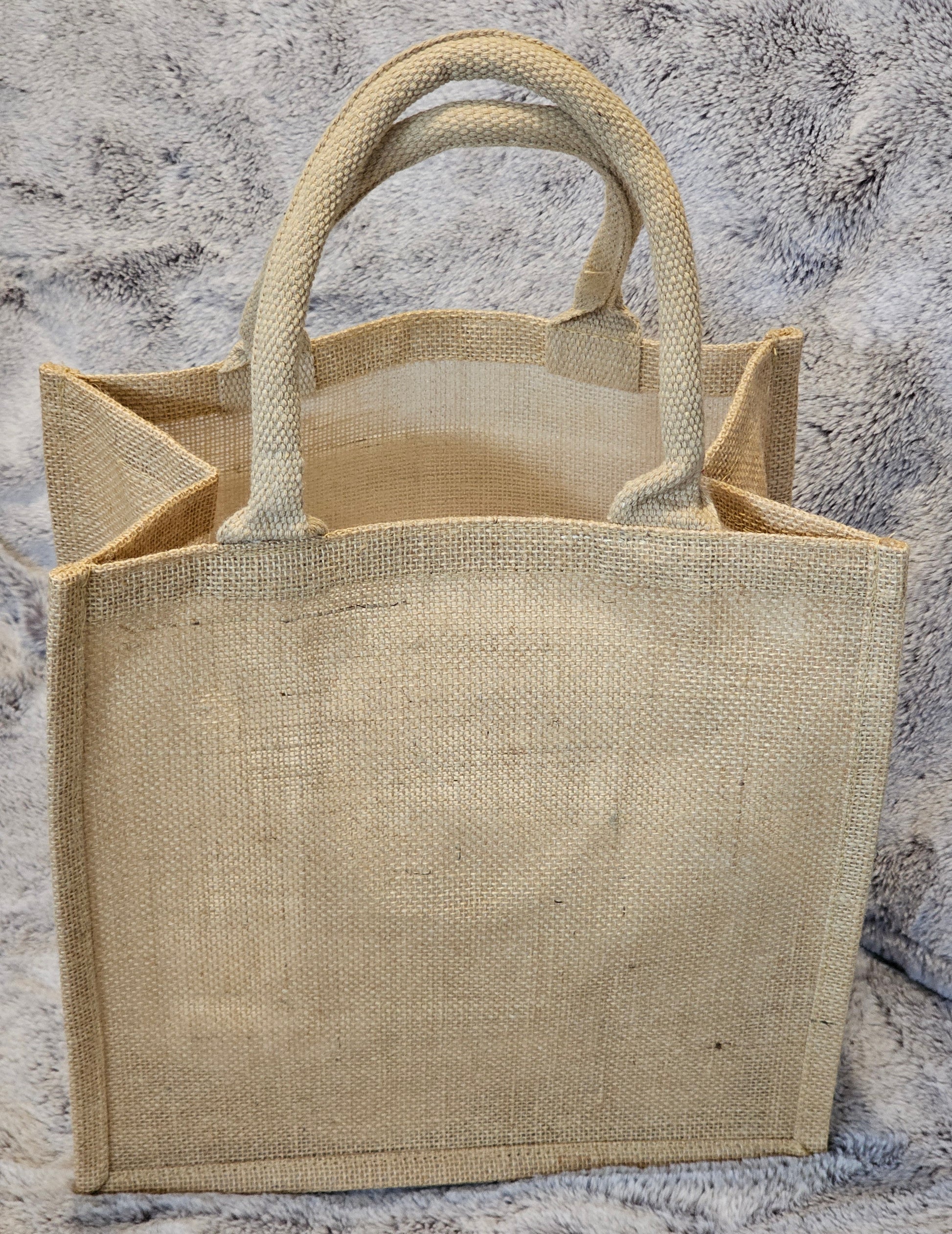 Jute tote shopper bag with cotton pocket featuring skull design.